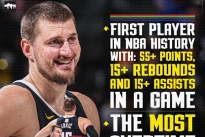 本场,约基奇出战43分钟,投篮21中15,三分6中4,罚球23中22,砍下56分16篮板15助攻2盖帽,正负值+15!