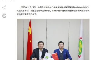 2025年12月26日,中国足球协会与广州体育学院共建足球学院合作协议签约仪式在北京举行。中国足球协会主席宋凯,广州体育学院校长胡敏等双方相关领导和代表出席了本次签约仪式。