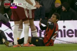 英超第20轮,阿森纳客场3-2逆转伯恩茅斯。比赛第95分钟,伯恩茅斯前锋阿明·阿德利从侧后方一头撞向加布里埃尔肘部,随后倒地捂脸,坐在地上向主裁投诉加布肘击,但主裁并无表示。