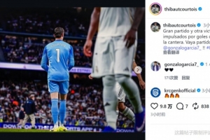皇马门将库尔图瓦社媒晒出比赛照片,配文:“精彩的比赛,我们青训球员的进球带来的又一场胜利。”