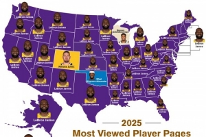 数据网站BBR显示,其网站今年各州被浏览次数最多的球员分别是:詹姆斯(47个州)、亚历山大(俄克拉荷马州)、约基奇(科罗拉多州)、字母哥(威斯康星州)。