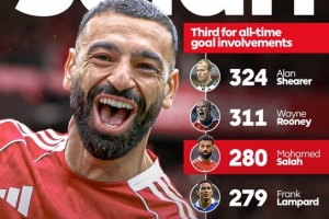 萨拉赫在英超中已经直接参与280球超越兰帕德,位居联赛历史第3位,仅次于希勒(324球)及鲁尼(311球)。