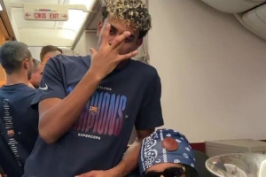 巴萨官方更新社媒动态,晒出亚马尔等球员在飞机内与奖杯合影的视频和照片,庆祝球队夺冠。