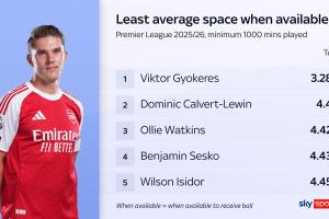 在英超球员持球时的平均“可行动空间”排行榜上,约克雷斯以3.28米的数据排名英超最低。