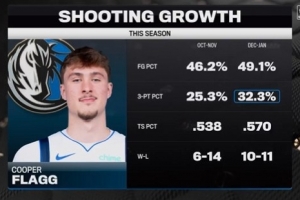 “我认为你知道他在赛季初期承担了很多,既要打控球后卫,又要努力给每个人传球,而最近几个月,他已经适应多了,他打得更加自如了,”诺维茨基说,“我会说他现在投篮时更加自信了,并不是说他改变了投篮姿势或技巧,只是带着更多信心去出手。自从更多回到他熟悉的位置后,他的节奏非常好,场均大概26分5篮板,命中率接近50%,他最近的投篮效率非常高。”