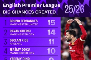 本赛季英超创造重大机会次数榜: