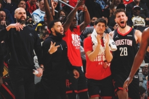 赛后火箭发布赢球海报,替补席庆祝瞬间成为封面,范弗里特、芬尼-史密斯、谢泼德和申京豆入镜,还有一位火箭助教。