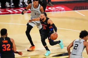 分散的火力其实适合打尼克斯。之前写尼克斯的时候提到过,这个队中路收的还是比较狠的,护筐也不错,还有若干素质优秀的单防人,头铁死磕他们并不容易。反倒是马刺这种东一榔头西一棒槌的进攻好使。季中赛决赛观感也是如此,马刺通过漂亮的转移球创造了不少机会,如果只看前三节,马刺打得非常好。